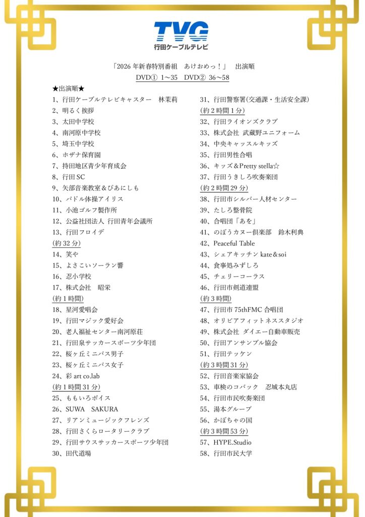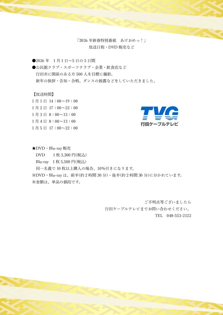 「2026年新春特別番組 あけおめっ!」にご協力いただきありがとうございました。出演順・放送日程・DVD販売などのお知らせです。